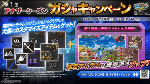 連動サイト「ガンダムVS.モバイル」にて期間限定で配信されるミッションをクリアすると、キャンペーンガシャが回せるチケットが手に入る。キャンペーンガシャでは、新規カスタマイズアイテムが出現するので、ぜひこの機会にキャンペーンに挑戦して、好みのアイテムでカスタマイズしてみよう。
