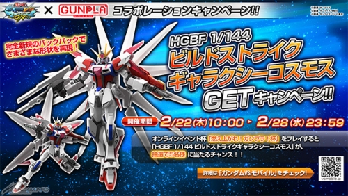 2月22日(木)より開催されるオンラインイベント杯にあわせて、2月24日(土)発売予定のガンプラ「HGBF 1/144 ビルドストライクギャラクシーコスモス」が当たるキャンペーンも開催される。