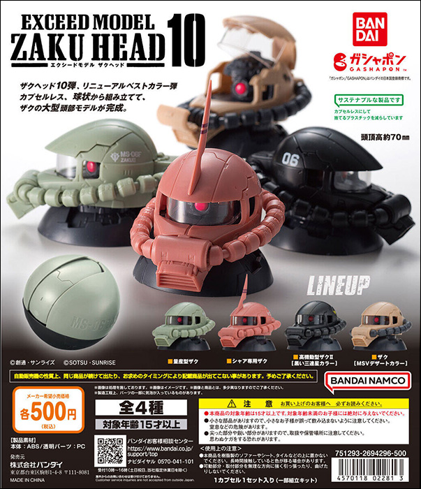 Nella terza settimana di novembre, ZAKU HEAD 10 si unirà alla serie EXCEED MODEL, che presenta modelli dettagliati di teste di Mobile Suit assemblate da una forma rotonda di capsule Gashapon.Saranno disponibili presso i distributori automatici Gashapon in tutto il Giappone e ogni gioco costa 500 JPY (tasse incluse).