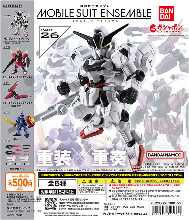 La 26a puntata della serie MOBILE SUIT ENSEMBLE, un marchio che si concentra sul tema delle silhouette che cambiano a causa degli armamenti, sarà in vendita presso le macchine Gashapon in tutto il Giappone a partire dalla quarta settimana di febbraio per 500 JPY (tasse incluse) ciascuna.