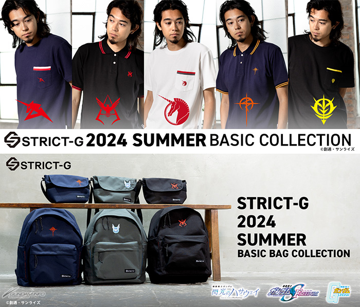 Nuovi articoli sono arrivati nella serie STRICT-G Basic, che presenta design semplici ispirati alla serie Gundam. Le polo e le t-shirt utilizzano il materiale Kanoko, caratterizzato da ricami a un punto e colorazione delle linee. Inoltre, gli zaini e le mini borse a tracolla sono realizzati in materiale Cordura, risultando in un design semplice e facile da usare.