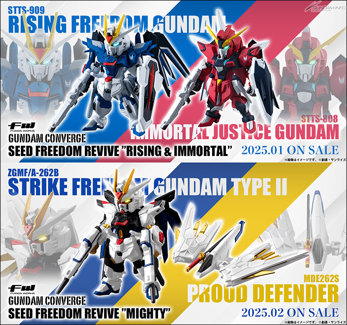 Il Rising Freedom Gundam e l'Immortal Justice Gundam di FW GUNDAM CONVERGE ♯24, e lo Strike Freedom Gundam Type II e il Proud Defender di ♯25 saranno ripubblicati come set SEED FREEDOM REVIVE.