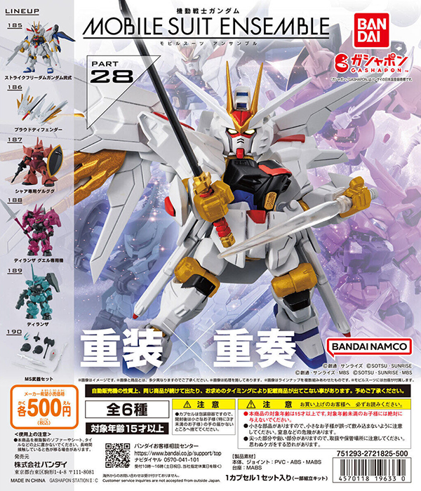 Mobile Suit Gundam MOBILE SUIT ENSEMBLE 28 è in vendita durante la 5a settimana di novembre presso i distributori Gashapon in tutto il Giappone. Saranno disponibili per 500 JPY (tasse incluse) per giocata.