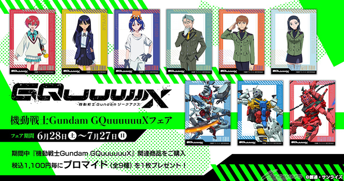Verrà distribuita una carta (nove tipi in totale, negoziabili) per ogni 1.100 yen (tasse incluse) spesi per l'acquisto o il pre-ordine del merchandising dei personaggi relativi a Mobile Suit Gundam GQuuuuuX / per ogni libro, CD, Blu-ray o DVD acquistato o preordinato (un minimo di 1.100 yen tasse incluse).