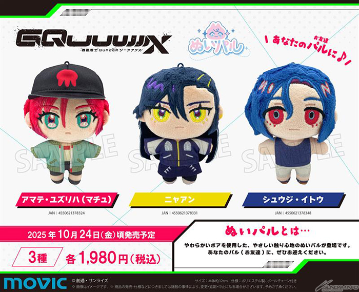 movic rilascerà Nui Pal, PashaColle e le spille conMobile Suit Gundam GQuuuuuuXe i preordini sono accettati presso Animate, Animate Online Store, Movic Online Store e altri negozi.