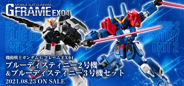I EX04 Blue Destiny Unit 2 e Blue Destiny Unit 3 set sono disponibili a partire da MOBILE SUIT GUNDAM G FRAME, una serie di figure Gundam articolate altamente dettagliate che possono essere completate attaccando armature sui telai.Sarà disponibile per 3.960 JPY (tasse incluse).