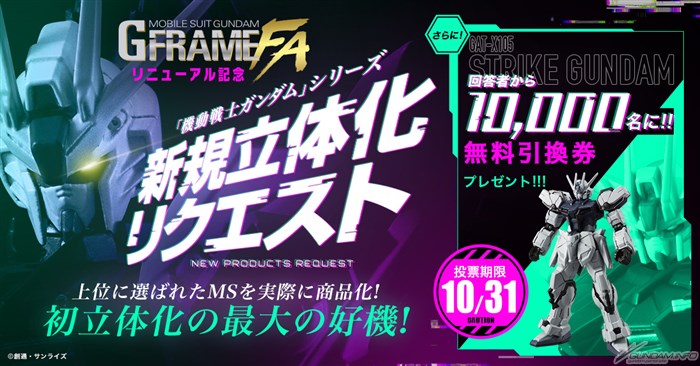 Inoltre, si terrà una nuova campagna di richiesta di articoli per celebrare il lancio di G FRAME FA.Non solo saranno popolari tute mobili che ricevono il maggior numero di voti essere rilasciati come figure reali, ma un totale di 10.000 clienti che si candidano per il sondaggio sarà selezionato tramite lotteria e vincere uno speciale biglietto di scambio gratuito per il G FRAME FA Strike Gundam (modalità Deactive).e vincere un libero speciale e