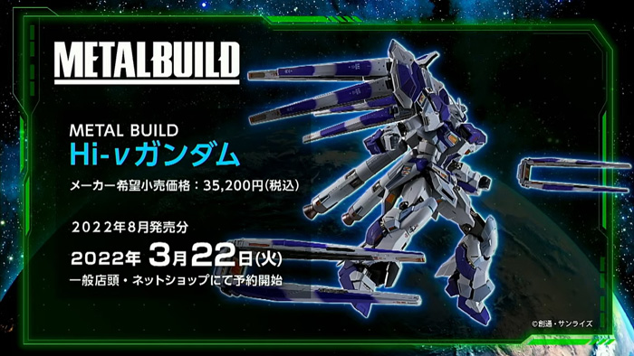 I pre-ordini per la costruzione metallica Hi-ν Gundam che vanno in vendita nel mese di agosto 2022 inizierà a negozi al dettaglio generale e negozi online il martedì 22 marzo 2022.Sarà disponibile per 35.200 JPY (tasse incluse).