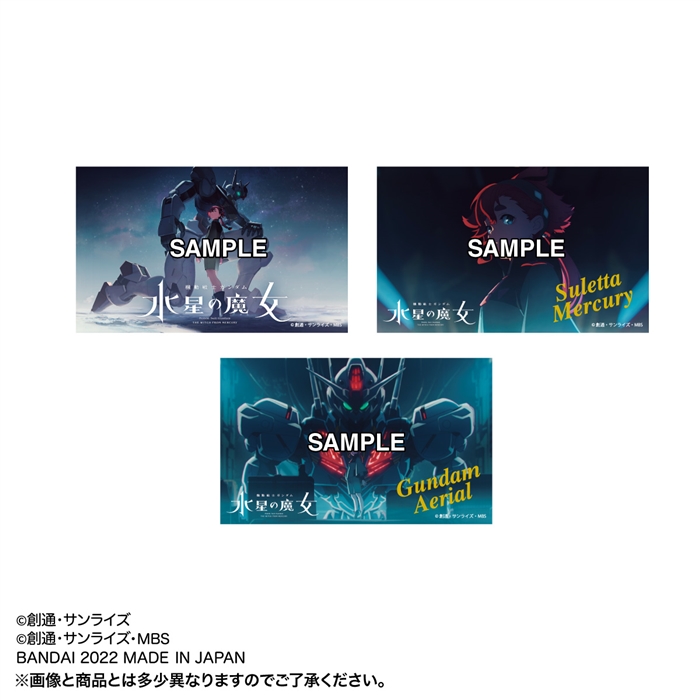 Adesivo con sfondi scintillanti che utilizza illustrazioni diMobile Suit Gundam la strega di mercurio.Due dei tre tipi hanno nomi foil-timbrati dei personaggi e tute mobili.