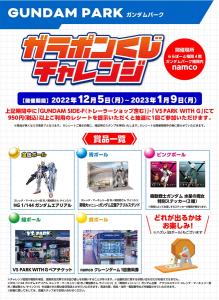 Mostrando le ricevute per gli acquisti di 950 JPY o superiore presso il Gundam Park Fukuoka locations GUNDAM SIDE F e VS PARK con G ti concederà un tentativo di girare una ruota della lotteria.