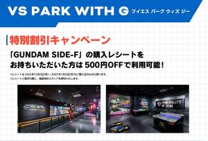 Portando il tuo GUNDAM SIDE-F ricevuta vi concederà uno sconto di 500 JPY a VS PARK con G, e ci saranno in piedi pannelli dei personaggi daLA STREGA DI MERCURIOa Namco.