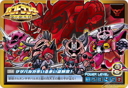 にくきゅう | 「SDガンダム アルティメットバトル」では、 幻の4体の星勇士(スターロード)がカード化されています。 当時から商品化されなかった星勇士もまだまだ存在するので、 この次に期待したいですね。 |