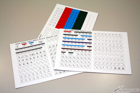 There are three unit sheets: One for Federation mobile suits, weapons, tanks, and flak; one for Zeon MSes and weapons, and one for pilots and status. Each is just waiting to be neatly punched out and placed in the unit tray.