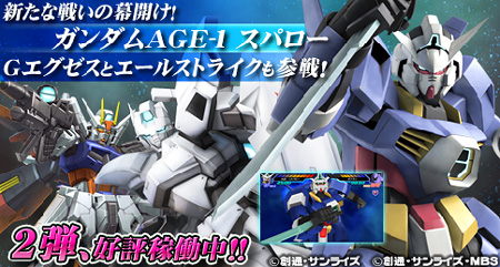 Set #2 adds mobile suits like Mobile Suit Gundam AGE's AGE-1 Spallow and G-Exes, and Mobile Suit Gundam SEED's Aile Strike Gundam and Aegis Gundam.