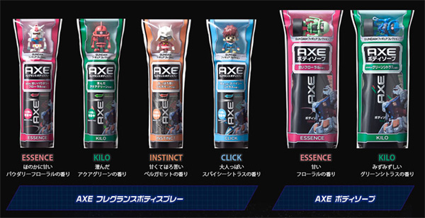 Unilever Japan's mens's fragrance brand Axe collaborates with Gundam to release the 'Gundam Original Figure-tsuki Axe' beginning 9/13 at drugstores and supermarkets nationwide.