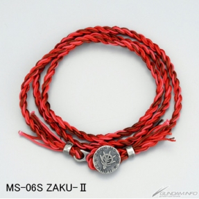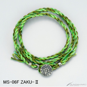The braided bracelets are available in "Char Custom Zaku" red, "Zaku" khaki, "Gouf" blue, and "Dom" purple, each with a Principality of Zeon clasp.