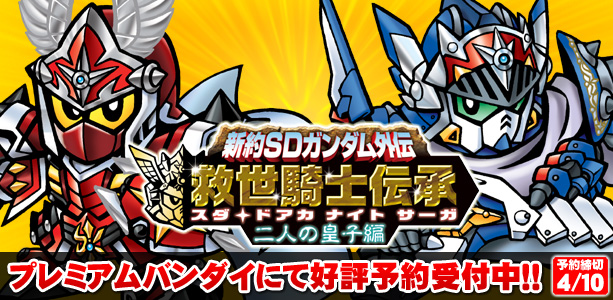 しかし今回の『新約SDガンダム外伝 救世騎士伝承 スダ・ドアカ・ナイト・サーガ 二人の皇子編』は、 「機動戦士ガンダムUC」や 「機動戦士ガンダムSEED」といった最新ガンダム作品からの、 完全新規設定の新キャラが続々と登場するので、これからの人でも充分楽しむことができる。