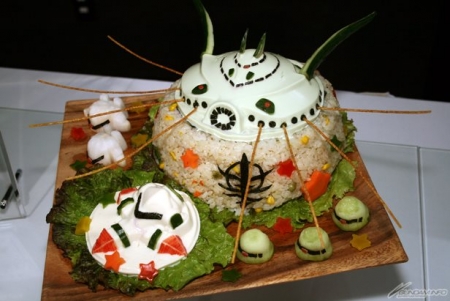 ジオラマレシピはこれまでの「ザクとうふ」、「ズゴックとうふ」でも作られており、その完成度の高さ、アイディアの妙から人気が高く、多くの人が足を止めて魅入っていた。