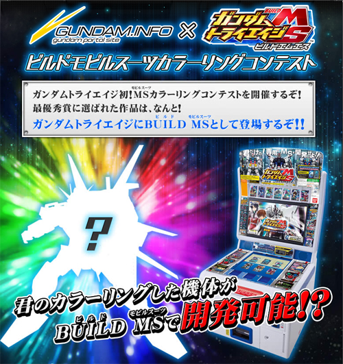 「ガンダムトライエイジ」公式サイトのコンテストページから好きなMSの画像をダウンロードし、オリジナルカラーで塗って応募すると、なんと 最優秀賞作品は今秋稼働予定の新弾に 『開発可能なBUILD MS』として、 優秀賞作品は『ミッションの敵機』として登場するぞ!