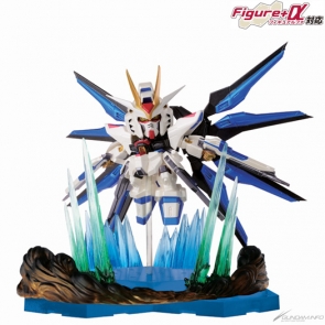 An SD figure of the Strike Freedom Gundam from Mobile Suit Gundam SEED DESTINY. It strikes a soaring pose with its Super DRAGOON wing. |