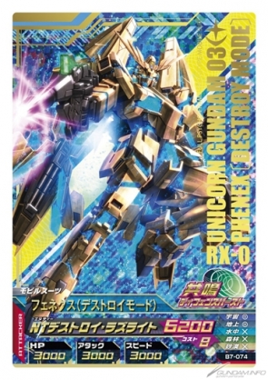 「BUILD MS 7弾」では、パーフェクトレアとして『機動戦士ガンダムUC episode 7「虹の彼方に」』より、「フルアーマー・ユニコーンガンダム(デストロイモード)」と巨大MA「ネオ・ジオング」、そのパイロットである「バナージ・リンクス」と「フル・フロンタル」が登場。