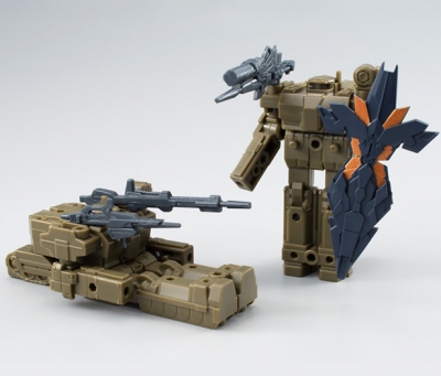 There's also Mobile Suit Zeta Gundam's eponymous lead suit, as well as the vulcan pod-equipped Gundam Mk-II (Titans colors) and Mobile Fighter G Gundam's Shining Gundam in Super Mode. The four stands combine into two Lotos which can be displayed in MS or tank modes.