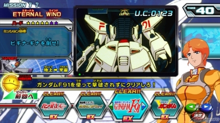 ▲ミッションでは各作品の物語を追体験できる。画像は『機動戦士ガンダムF91』をテーマにした「ETERNAL WIND」。