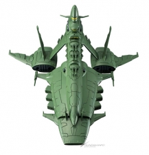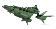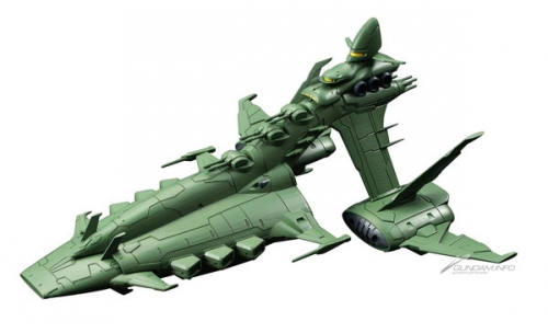 Dozle's flagship in Mobile Suit Gundam The Origin stretches 190mm of realistic sculpting, including upgraded mega particle cannon turrets compared to the Musai class's standard fittings which can rotate freely. Its bridge, a spaceworthy Komusai in its own right, can also be detached.