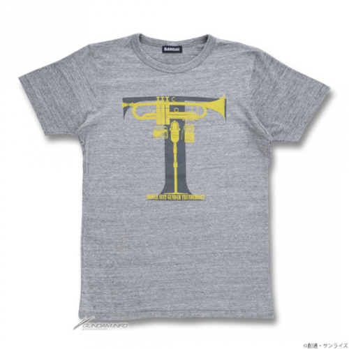 「イオ レコード柄 Tシャツ」は、サイド4(ムーア)のマークをレコード柄にアレンジしたデザインとなっている。「トランペット柄 Tシャツ」は、作品タイトルの頭文字Tに、トランペットとラジオを重ねたジャズTシャツ。「FA-78柄 ポケット付Tシャツ」は、スピーカーネットイメージに、フルアーマーガンダムを重ねたデザインをあしらっている。「MS-06R柄 ポケット付Tシャツ」は、音量ボリュームゲージに、サイコザクを重ねたデザイン。