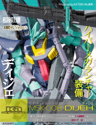本アイテムは、『機動戦士Ζガンダム』よりアムロが再びパイロットとして戦地に赴く際に登場したMS「ディジェ」を「Ka signature」で立体化したもの。劇中での設定を改めて考察し、映像では描写がなかった左肩ウェポン・ラックへの武器のマウントを再現し、付属するすべての武装を装備できる。