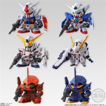 The line-up includes 6 mobile suits: Gundam Exia, Unicorn Gundam (Destroy Mode), Gundam, Marasai, Marasai (Earth Federation Version), and Gundam TR-6.