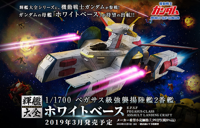 Della divisione di BANDAI spiriti collezionisti "Kikan-Taizen" serie rilascerà il "1/1700 Pegasus-classe Base di bianca Landing Craft Assault" Da "Mobile Suit Gundam" Rilascio di marzo 2019, prezzo è di ¥ 7,992 (IVA inc.) Prenotazioni saranno prese nei negozi a partire 1 novembre, 2018 (Gio.)