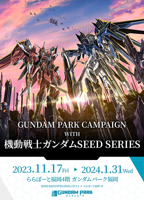 Inoltre, il Gundam Park Quiz Rally Project è attualmente in corso al Gundam Park Fukuoka dove si trovano GUNDAM SIDE-F e la statua di Gundam a grandezza naturale ν (Nu).Non perdere questa opportunità per ottenere un originaleMobile Suit Gundam SEED FREEDOMadesivo (disponibile in base all'ordine di arrivo).