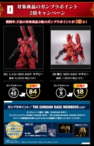 In questa campagna, l'acquisto di determinati GUNPLA ti farà guadagnare il doppio dei punti durante il periodo dell'evento e potrai anche ottenere un file chiaro presente con l'acquisto di determinati oggetti.