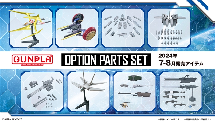 Un totale di otto Option Parts Set GUNPLA (da 05 a 12), che possono essere utilizzati per personalizzare gli articoli venduti separatamente, saranno rilasciati in sequenza nei mesi di luglio e agosto.