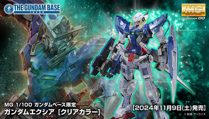 MG THE GUNDAM BASE Limited Gundam Exia [Clear Color] sarà in vendita sabato 9 novembre presso i negozi THE GUNDAM BASE, strutture generali GUNPLA. Sarà disponibile al prezzo di 4.180 JPY (tasse incluse).