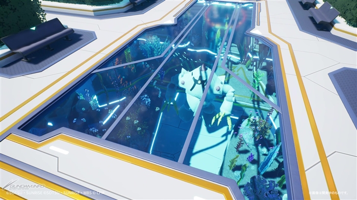 L'atrio principale è uno spazio basato su uno spazio colony e la città dall'altra parte del colony può essere vista sul soffitto, creando una vista coinvolgente. Varie statue di Mobile Suit sono allineate all'esterno e puoi goderti gli sguardi ravvicinati.