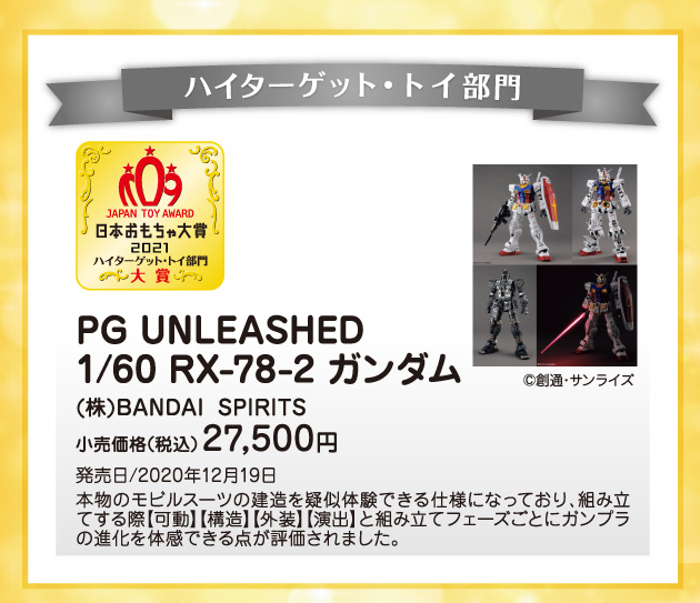 Il PG UNLEASHED 1/60 RX-78-2 Gundam GUNPLA ha vinto il Gran Premio nella categoria giocattolo di alta destinazione del Japan Toy Awards 2021 sponsorizzato dalla Japan Toy Association.