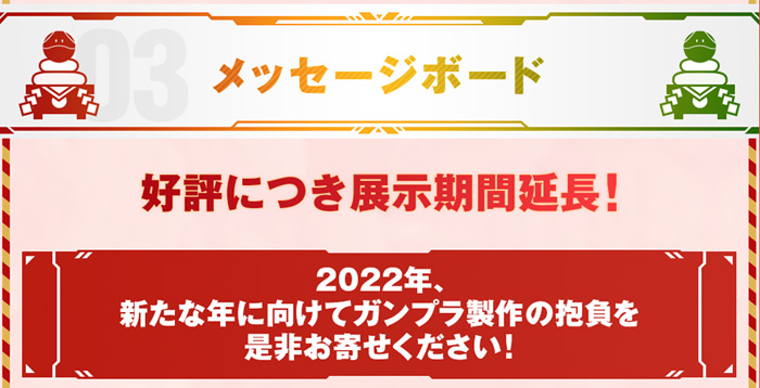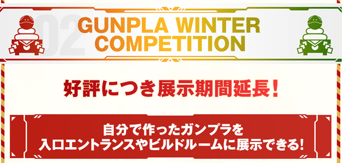 Durante questo evento saranno disponibili per la partecipazione un workshop di assemblaggio GUNPLA, il concorso invernale GUNPLA e bacheche per i messaggi.Durante gli eventi, ci saranno i regali per i partecipanti disponibili, quindi assicuratevi di check it out.