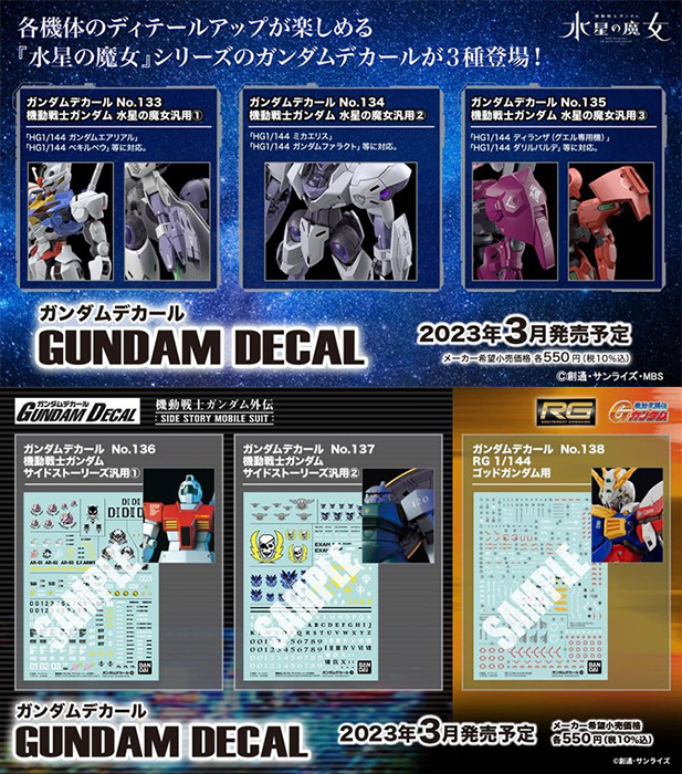 Le decalcomanie Six Gundam come la Mobile Suit Gundam la strega di MERCURY Multiuse e Gundam decal n. 137 per RG God Gundam andranno in vendita nel marzo 2023.