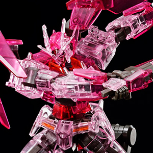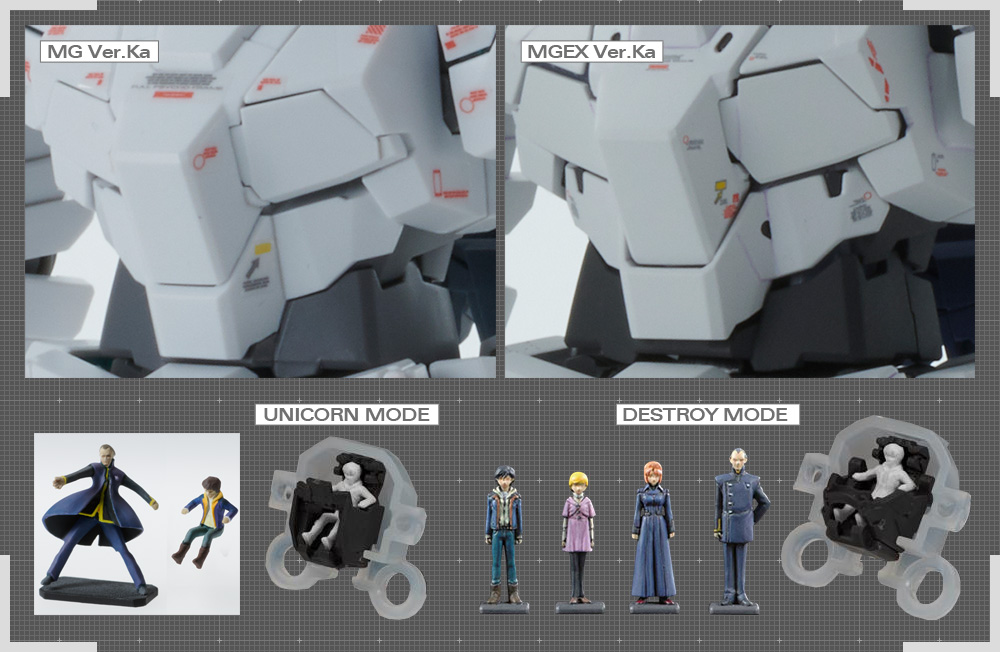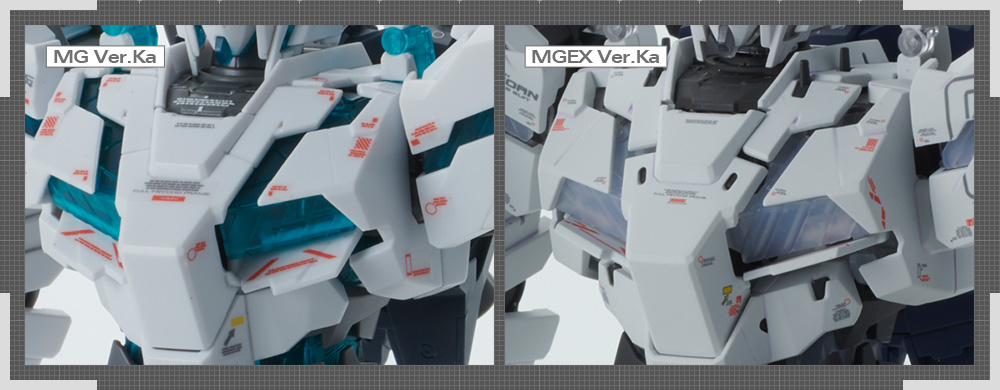 "The slight increase in size around the shoulders on the MGEX can be seen. The Psycho-Frame has been changed to a translucent milky white color and its details stand out when in Destroy Mode."