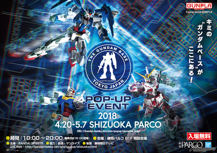 È stato deciso che \"THE GUNDAM BASE TOKYO pop-up EVENT\", un evento che si condensa il fascino del centro Gunpla GUNDAM THE BASE TOKYO in un unico luogo, si terrà presso Parco di Shizuoka a partire dal 20 aprileth (Ven). L'ingresso è gratuito.