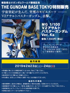 Di premio Bandai MG V2 Assault Buster Gundam Ver.Ka sarà venduto per un tempo limitato al Gundam Base Tokyo il 23 febbraio, 2019 (Sab) e 24 (sole). Prezzo è di ¥ 7,560 (IVA inc).