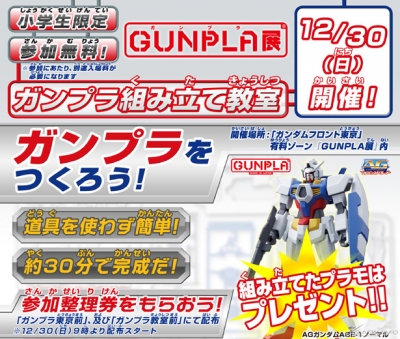 東京・お台場「ダイバーシティ東京 プラザ」7階で営業中の最先端エンターテインメント・スペース「ガンダムフロント東京」では、有料ゾーン内のミュージアムスペースで実施中の「GUNPLA展」にて、12月30日(日)に「ガンプラ組み立て教室」が開催される。
