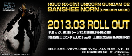 Mobile Suit Gundam UC episode 6 "Two Worlds, Two Tomorrows" will premiere on March 2nd. The Unicorn Gundam 02 Banshee Norn's Unicorn Mode, featured in the episode, will roll out in HGUC too! Shipping in March, the kit will cost ¥1,785.