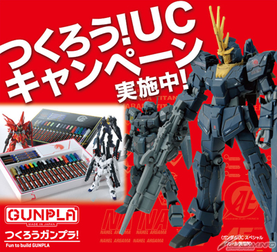 キャンペーンは店頭で「RG」か「HGUC」シリーズのガンプラいずれか1個を購入するごとに、ここでしか手に入らない「ガンダムUC スペシャルデカール」1枚と、「ガンダムUC スペシャルマーカーセット」への専用応募券が、もれなくその場でもらえるというもの。