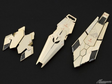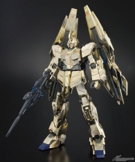 Its golden armor is recreated with plating, and its Psycoframe uses clear parts! It even transforms from Unicorn to Destroy Mode! The kit includes an arsenal of weapons, including an extending Armed Armor DE.