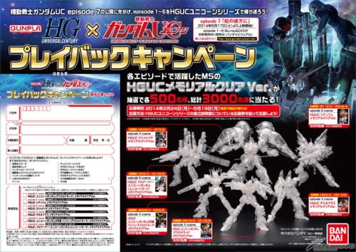 本キャンペーンは、対象商品の組立説明書に付いている応募券1枚を、店頭チラシ付属の専用応募ハガキ、または官製ハガキに貼り必要事項を記入して応募すると、episode 1からepisode 6の各エピソードで活躍したMSの「HGUC メモリアルクリアVer.」が、抽選で各500名・総計3,000名にプレゼントされるというもの。