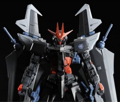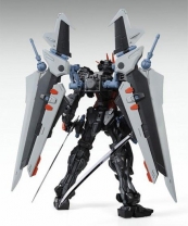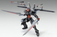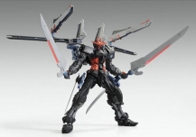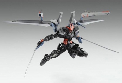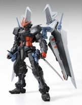 The MG Gundam Astray Noir is molded in its distinctive black and red color scheme. Its Noir Striker is packed with opening hatches and detachable weapons, and it can combine its gun and katana to form its sword pistol.