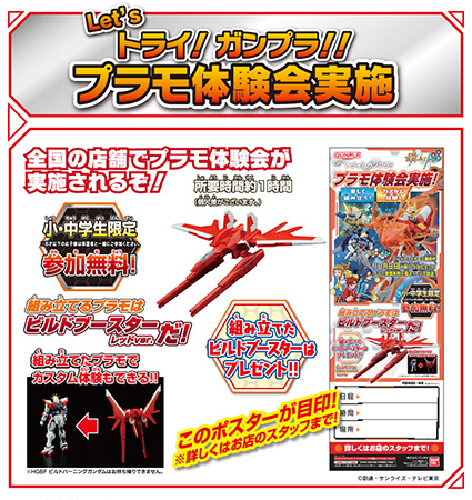 「トイザらス」や「エディオン」などの全国のプラモデル取り扱い店舗では、小・中学生を対象にした「Let's トライ!ガンプラ!!プラモ体験会」が、明日10月4日(土)より順次実施される。